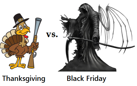 So as I prepare to start my Thanksgiving today, I do so on my terms. I plan to Thank God for all the blessings in my life, enjoy a feast with my family and friends, and watch my Pittsburgh Steelers fight their own evil force- the Baltimore Ravens. And I will work to maintain this same spirit and focus throughout the entire 4-Day weekend. And when I go back to the office on Monday, I go with the knowledge that I will be surrounded by “Black Fridays” threatening to trample my “Thanksgiving”… and I will fight to defend it. So I wish you all a very Happy Thanksgiving, and also that your Friday not be “Black”.